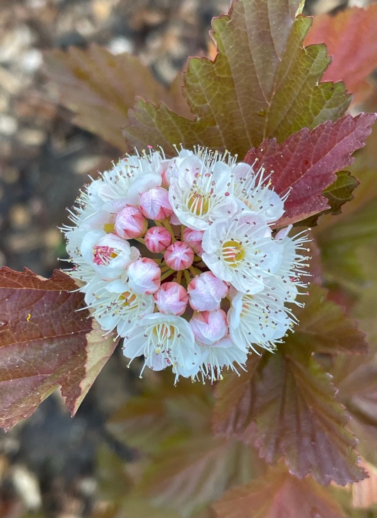 The sense of secrets being exposed is found everywhere. As I examine the young beech hedging I notice the snowball flower of a physocarpus and a cluster of its tiny buds still waiting to pop. The garden truly reveals itself in May but beech is a stubborn character. Refusing to drop its leaves in winter and delaying coming into leaf in spring.